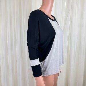 Black and grey top with three quarter raglan sleeves. Lightweight, loose fitting and comfy. 96% Rayon 6%Spandex