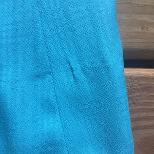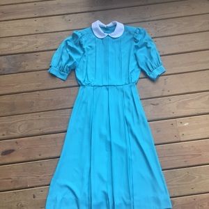 Teal/Turquoise Adorable Pleated Knee Length 80's Vintage Dress. No tag but fits like a small to medium depending on measurements which I will post as soon as I can. (Waist 28, bust 40). Would look cute w/ schoolgirl shoes the right cardigan/belt. Also could be worn without accessories and be just as adorable! Small shoulder pads sewn in but they are not really noticeable or bulky. Only flaw is a small snag in back of fabric as pictured. Completely unnoticeable when wearing. Bundle and Save $$$