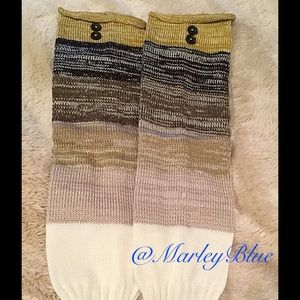 So pretty and different! Rainbow leg warmers in neutral tones. Colors are mustard, brown, tan, and white. Will go with any color outfit...so versatile! Two buttons at top of warmer for added charm! Acrylic. New retail item. Bundle to save 10%. Feel free to ask questions 💗$22