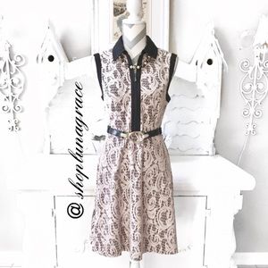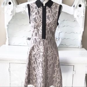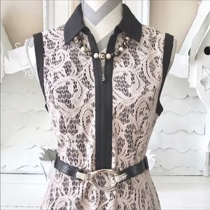 Beautiful nude lace fully lined in black collared fit & flare dress. Black banded armholes, front zip, unzips to waist. Polyester/dry clean only. Bust measures 17.5" across laying flat, waist, 16" laying flat & 36" from shoulder to hem.
