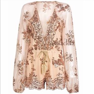 Rose Gold Sequin Sheer Romper Party Outfit