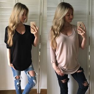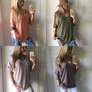Loving this top, I personally have owned it in a few colors for a while now and wear mine all the time. Great alone or with a cute Cardigan. Pairs cute with leggings and all denim. Love the longer length, v-neck, rolled sleeves and rounded bottom hem. Available in multiple colors ( Mocha, Olive, Lavender, Nude, Black, Smokey Raisin )