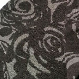 Sleeveless high necked top with ruffles down center front and at neckline. Buttons at back of neck creating keyhole cutout at upper back. Gray with black rose pattern