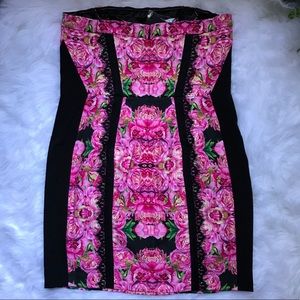 Sexy curves take center stage with this strapless dress printed with lush and dramatic peony blossoms and framed with scalloped black lace.