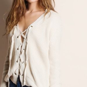 Lace up sweater top. This is an ACTUAL PIC of the item - all photography done personally by me. Model is 5'9" 32-24-36 32A wearing the size small. NO TRADES DO NOT BOTHER ASKING. PRICE FIRM.