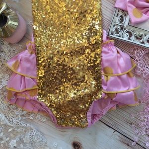 Cute halter style Romper with matching headband. This pink and gold polkadot Romper has tie at neck for adjustable fit. Full sequin gold bling in front and adorable ruffles to back!! Perfect for 1st Birthday and cake smash photos!