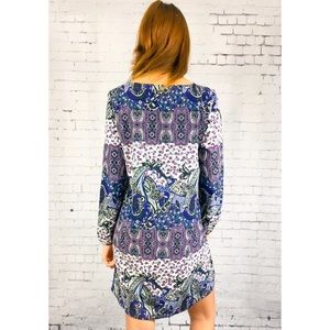 Purple, white and Blue paisley Shift Dress featuring a very beautiful unique pattern. Features a V Neck front. Sizes S,M,L. Fabric.