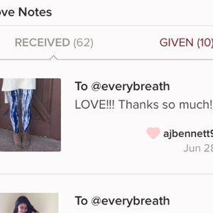 Infinity Raine blue & white (with a bit of gray) tie-dye print leggings! Super soft brushed knit leggings are one size and fit S-L nicely (up to a size 12 has been confirmed by customers). 1st & last photos courtesy of @infinityraine. PRICE FIRM UNLESS BUNDLED (10% off bundles). 💙92% Polyester 8% Spandex 💙Hand wash 💙Waist: 12" across when flat 💙Rise: 11" (see last photo) 💙Inseam: 26" 🚫PayPal 🚫Trades