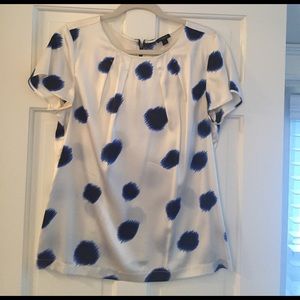 Beautiful Ann Taylor short sleeve silk top, with a bit of stretch (91% silk, 9% spandex). Cream color with blue/black abstract dots. Zips up the back for a stunning look.