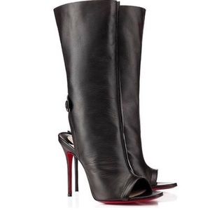 Authentic Christian Louboutin Mistinguetre Peep-Toe Mid-calf boot. Black leather. Worn 3 times. Have original dust bag but no longer have the original box.