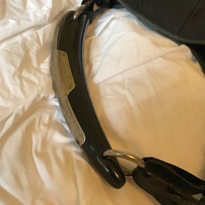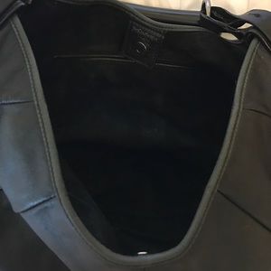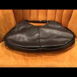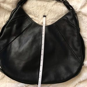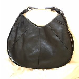 Coveted horn bag with silver metal hardware, length from shoulder 19', 16.5' wide, inside lined in black suede, outer is gorgeous black leather, a stunner of a bag! Lightly used, looks brand new.