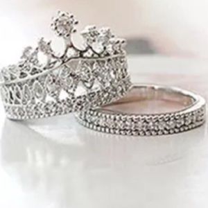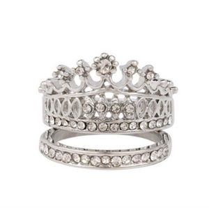 🎉 Fun fashion ring. Silver colored bands. One with crown design; the other ring is a band. What you should know: photo makes ring appear more vibrant than in person, especially because photo is close up. Hard to see individual stones in person, but still an adorable and unique design. Can be worn together or separate. Fun to wear ring. Size 7. 4th photo depicts the most accurate visual. 2nd photo is actual ring set. Size 7 & 8 available. Price firm unless bundled