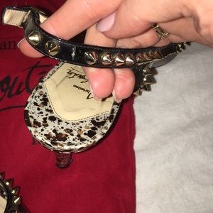 These are authentic manovra white/smoke Christian Louboutins that have been worn 4 times. These are a slingback heel with spike detailing. Size 37, heel height 70. This sale will come with the box, shoe bag, and additional heel replacements, shown in photos. There has been one spike in the back of one heel missing since purchase, shown in photo. Happy to answer any questions you may have!