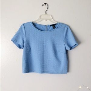 A F21 Baby Blue crop with a textured design and silver zip up back. It's a large however I think a small/medium will look great as well! Pair these with a statement necklace, trousers a skirt or some shorts and you're ready to go! I wear a small/medium in forever 21 and the top fits loose and covers my belly button. I am 5'4