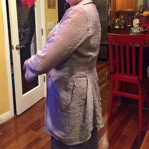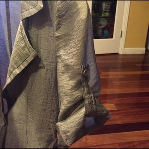 So cute and unique. Great for all seasons 🙂 sheer shirt/blazer. Grey with black top stitch, pleats in the back. Three-quarter length sleeve's but can be rolled up to be shorter. Button on sleeves. Made in Korea. (Says "L" but fits as a small/med).