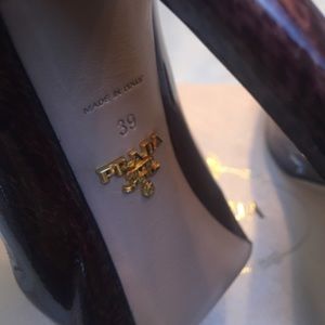 Prada vernice st pony maroon heels. Patent Leather calfskin. Small Cheetah print throughout. Has the Gold Prada logo on sole. Comes with box dust bag and authenticity card. These shoes are in great condition!!