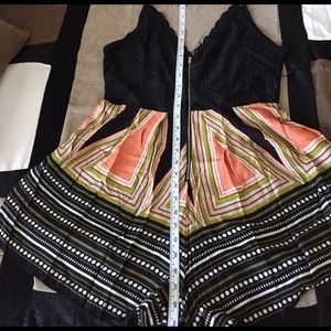New and nice! bust area is lined by a black fabric. Waist: 31", Bust: 20". I am not sure about the size because the romper has no size tags, but based on the measurements I believe it would fit an XS or S or not a tall person, because the length from top of straps to crotch area is 28" to 29"