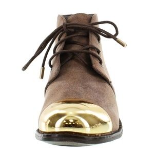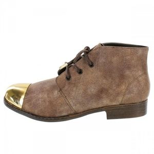 You'll love the chukka styling and shiny metal toe cap of these booties! Features a distress faux suede upper, low stacked heel and lace-up closure.