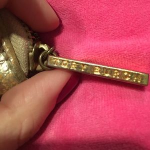 Tory Burch Reva Metallic wallet - an instant classic with a touch of gold sparkle! Standard size wallet, card slots on both sides as you can see in the photos. Lightly worn on the outside but overall good condition- minimal scratches and signs of wear. Inside wallet is like new- not stretched out all!