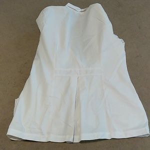 White lab coat has 2 front pockets 3 button closure and pleated back as seen in pic 2 also has a small ink stain above right pocket long sleeve and thigh length no size tag but I am listing it as a medium