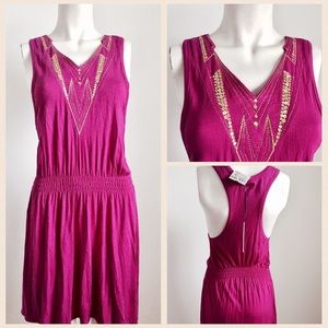 Detailed purple and gold dress by Sweetees. Brand new with tag. Has a sequin design around the neckline and elastic waist. Brand new with tag. #2181705