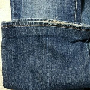 WOMEN'S MEDIUM DARK WASH CITIZEN'S OF HUMANITY JEANS, STYLE NAOMI #065 STRETCH LOW WAIST FLAIR SIZE 27, HAS LIGHT FRAYING ON TOPS OF FRONT POCKETS, TOPS OF REAR POCKETS AND ONE SIDE OF EACH BOTTOM HEM OF LEGS, ARE IN EXCELLENT USED CONDITION.