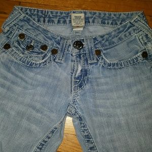 EUC 2 pair of True Religion Joey Big T jeans. One lighter wash with white stitching. One medium wash with multicolored stitching with extra distressing details. Wrap around hems. Great jeans, but too big for me! Both size 26.