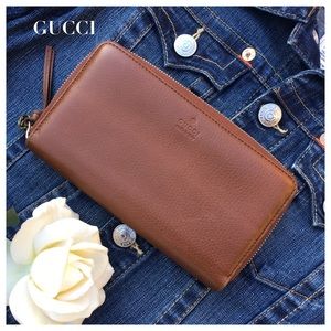 Gucci wallet with 12 card slots, dual cash slots, zip coin compartment & zip around closure. Minimal wear/marks on leather as shown in pics. Hardware: Gold-tone. Lining: Leather. Color: Brown, Tan, Camel. Material: Grained leather. Approx Measurements: Height 5.5”, Width 8”, Depth 1”. Condition: Excellent. Includes box & dust bag.