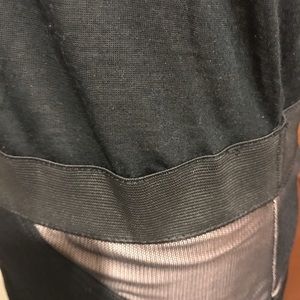 Cute, versatile black dress from BCBGMaxAzria. Excellent used condition, barely worn. Lightweight, very slightly sheer blouson top w/tulle accent at armholes and tulle-covered chain detail around the neck. Gives a really nice, subtle gleam. Stretchy dual-layer skirt, w/panels of sheer and opaque black over a second opaque tan layer. Wide banded elastic waist. The shirt part has slightly separated from elastic in a small spot (see last pic) but it's really small and easily fixed (not a tear).