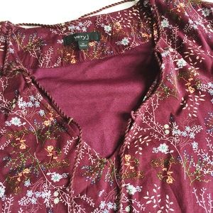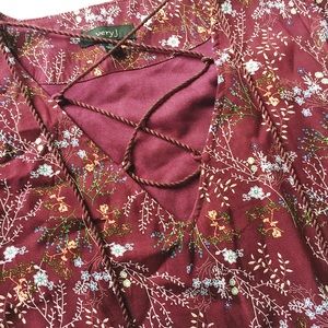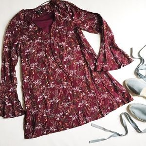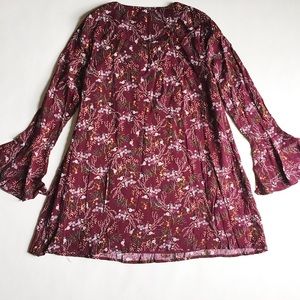 Bell Sleeve Floral Dress in burgundy featuring delicate print in blue, green and yellow. Tie at neckline, can also be worn laced up. Easy pull on style. Hidden side zipper, fully lined. NWT, never worn! Boutique brand. Fits like a 6/8.