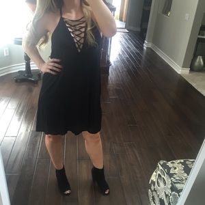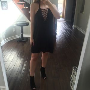 Such a pretty dress that can be worn for a night out or running errands. My favorite criss cross front detail. Adjustable straps and lined with a black slip with a semi sheer whimsical fabric on top. Modeling size S runs true to size.