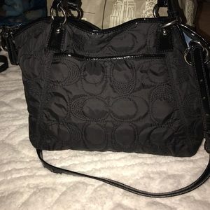 Gently used Coach purse - quilted material with patent leather accents - has handles and long adjustable strap- outside front & back pocket