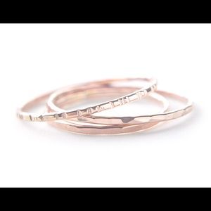 A set of three, 14K yellow gold filled skinny 1mm stackable band rings; faceted, textured, & etched.