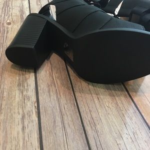 The hottest shoe style of the season. Lace up open toe Booties can be worn any time of the year. In a classic black color made of faux leather material with a chunky 3.5" inch heel. Style them with practically any outfit in your closet. Pic 1 for styling purposes only.