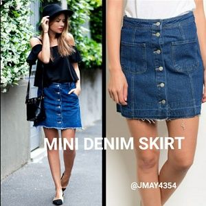 Classic Denim A line Button down mini skirt. Raw edge hemline. Two front pockets. Little to no stretch!