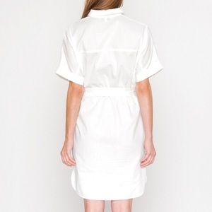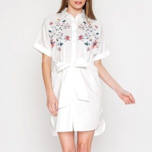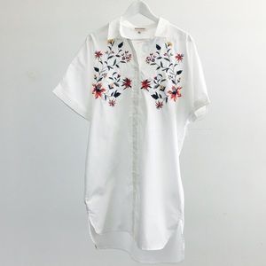 White short sleeve shirt dress with floral embroidered print, shirttail hem, and self-tie waist. 65% cotton 35% rayon. Brand new. Please carefully review each photo before purchase as they are the best descriptors of the item. My price is firm. No trades. First come, first served. Thank you! :)