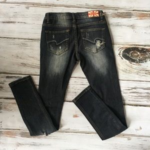 Machine destructed darkwash skinny jeans. Destructed fronts and back pockets. Some stretch to the fabric for a perfect fit. Juniors sizing with exact waist measurements. 97% Cotton and 3% Spandex. Labels indicate both sizes on the tag.... Junior size/waits inches: 0/25 1/26 3/27 5/28 7/29 9/30 11/31 13/32