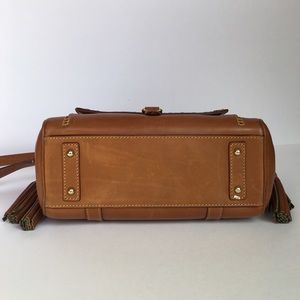 *GOOD as new. Supple Florentine leather has the look and feel of fine saddlery and, like saddle leather, it develops a rich patina over time. H 8.25" x W 5" x L 11" One outside snap pocket. One outside pocket. Two inside pockets. One inside zip pocket. Cell phone pocket. Inside key hook. Adjustable, detachable strap. Handle drop length 4.25". Strap drop length 24.5". Lined. Feet. Zipper closure.