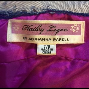 ABSOLUTELY BEAUTIFUL Purple Prom Dress with Silver sparkle glitter splotches. Hailey Logan by Adrianna Papell. Brighter purple satiny lining with darker purple sheer overlay with silver glitter. Spaghetti straps, full length. Sheer see through key hole in back. Hidden zipper on the side. Princess neckline. It was worn once and is in great like new condition. Measurements laying flat: pit to pit: 16", waist: 14", waist to hem: approx 43". Great Dress, Great price!