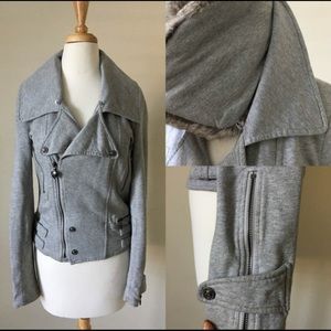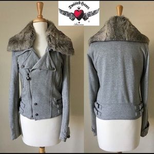 "Twisted Heart" 💕 Detachable real rabbit fur collar blazer style with many zippers and side buckle details. One side snap is broken (picture attached) Size: Medium. Length: 23". Chest(armpit-armpit): 19 1/2". Sleeve Length: 25"
