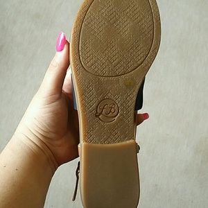 Spring and summer just around the corner don't forget to complete your outfit with cute sandals. These are man made material. Thong and strap. It's cashew/Moroccan blue (looks black) they only come in full sizes, but if you are 8.5 you would get an 8 size.