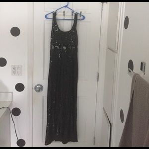 Size six long black dress. It has a tighter fit with a slit at the bottom. It's a size 6. Cut outs and embellishment under the chest! Truly beautiful. Great for prom