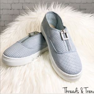 Super cute perforated serenity blue slip on sneakers. Featuring a functioning silver zipper. Thick rubber upper sole. The trend of the season.