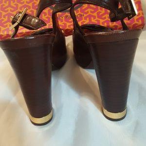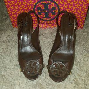 Authentic Tory Burch soft leather peep toe chunky wooden heels gold trip very elegant goes pretty much with anything from Jeans to dresses