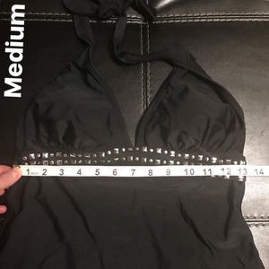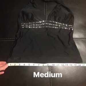 NWT Black tankini with metallic embellishments below the bust. Fold over bottom with same metallic embellishing on the waist. Great two piece swimwear. Other sizes available upon request.
