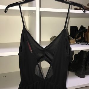 Long black dress with cut out on the front and v neck open back, sheer bottom with side slits