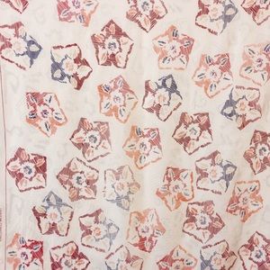 Vintage silk scarf. 'Star-flower' print in shades of red, orange, purple,blue and light gray. Hand hemmed.