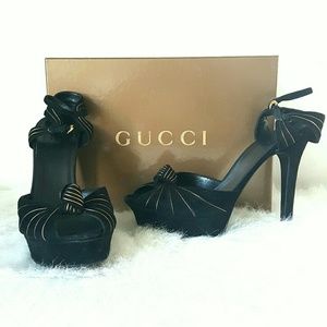 Gucci Suede Platform Heels - black suede with gold detail. Ankle strap with signature horsebit closure and twisted knot detail. Have only been worn a few times. Had sole protectors professionally installed before they were even worn so these beauties are in very good pre-loved condition.