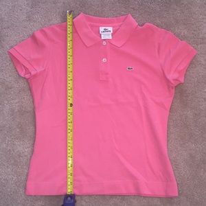 Excellent pre-owned condition. Size 42, but fits like a M/L. Sort of salmon pink in color. Goes perfect with classic Lilly Pulitzer pieces. Great for golf, tennis & classicly preppy looks. Feminine, but stretchy fit. 22" in length. Only flaws are noted in last pic (pen mark on bottom border and ~1 cm snag) neither of which are noticeable on. Price reflects condition. I have other Lacoste items in my closet as well. Bundle for an even better deal. Have a question? Ask away✌bust unstretched is 18”