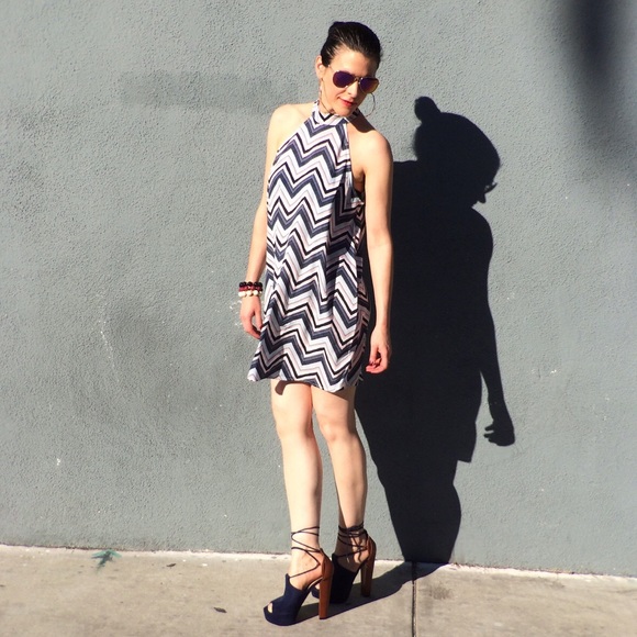 NO TRADES. Nautical meets urban! This dress screams spring and summer! Blue chevron print with red and white accents. High-collar neck with buttons. Unlined, but fabric is a good weight. Classic print in a modern silhouette! Runs true to size. Modeling size S in pics. Size chart in pics. 100% polyester. Hand wash cold. From Moon Collection. So cute with platform sandals or white sneaks!